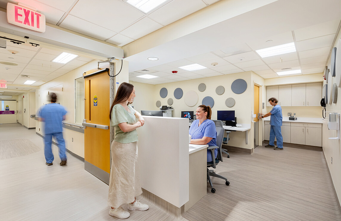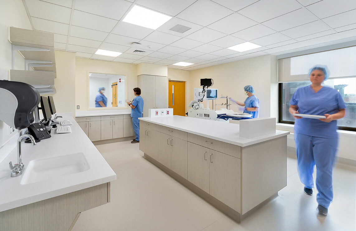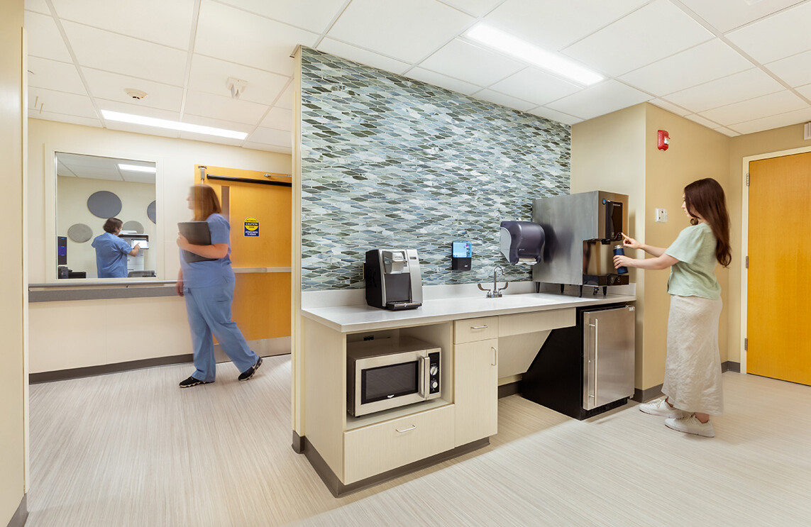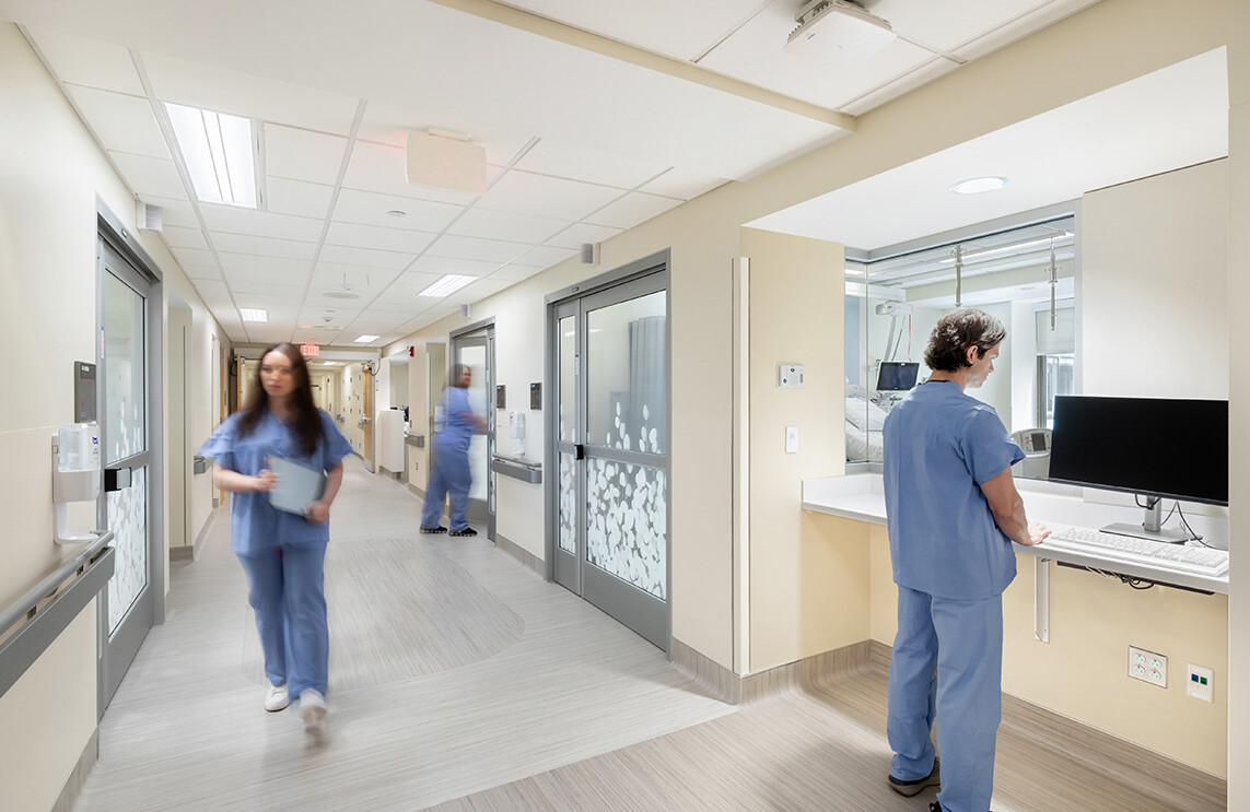 The project also includes the renovation of three operating rooms exclusively for organ procurement, preventing the use of critical ICU spaces needed for other patients. Donors arrive through the Emergency Department and are transitioned to this unit for final preparations before being moved directly to the dedicated ORs. After procurement, organs are transferred to a specialized lab space, equipped with OR-level air quality, where they are tested and prepared for transport across the country.